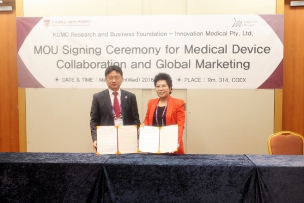 의료원산학협력단은 최근 코엑스에서 진행 된 바이오 코리아 2016 행사장에서 글로벌 의료기기 컨설팅 기업인 Innovation Medical(대표 Young Cheigh)과 의료산업화 및 글로벌 마케팅을 위한 MOU를 체결했다.